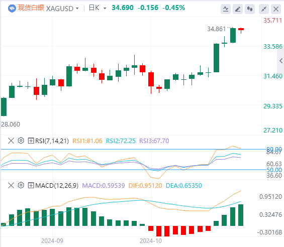 黄金攀升1%,创下历史新高,因美国大选的不确定性和中东战争等因素刺激了避险需求,加上对进一步放宽货币政策的预期放大了金价升势。现货金收盘上涨1.06%,至每盎司2748.4美元,盘中触及纪录高位2748.8美元附近。