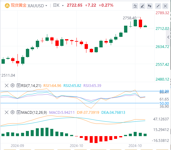 黄金昨日在触及到新的历史高点2758附近后,就无力再继续冲高,美盘时段则上演了高位跳水行情,极限跌幅达到了近50美元/盎司,为本轮上涨行情启动以来的最大单日回撤行情,这预示着金价多头趋势或已接近尾声,后市转空的概率增加。从均线上来看,金价目前已经跌破了MA60均线,但EMA144均线以及EMA169均线仍在为金价提供支撑,这表明黄金目前并未完全转势,日内或将先延续一段时间的高位震荡走势。上图中画出了金价目前面临的重要支撑位,压力位以及预期的后市走势图,预计日内金价将在短暂冲高后继续回落,故操作上建议以逢高做空为主。