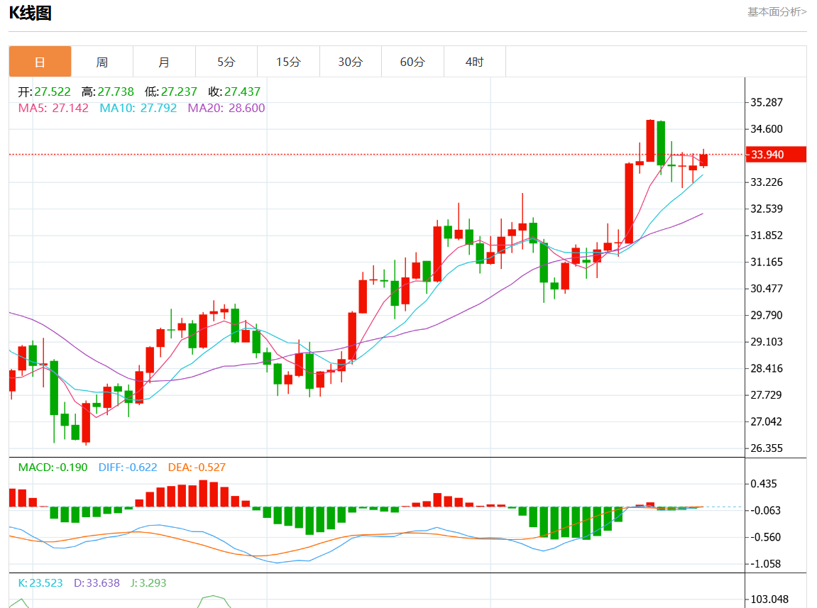 周二欧市盘中,现货白银报33.910,跌幅0.74%。