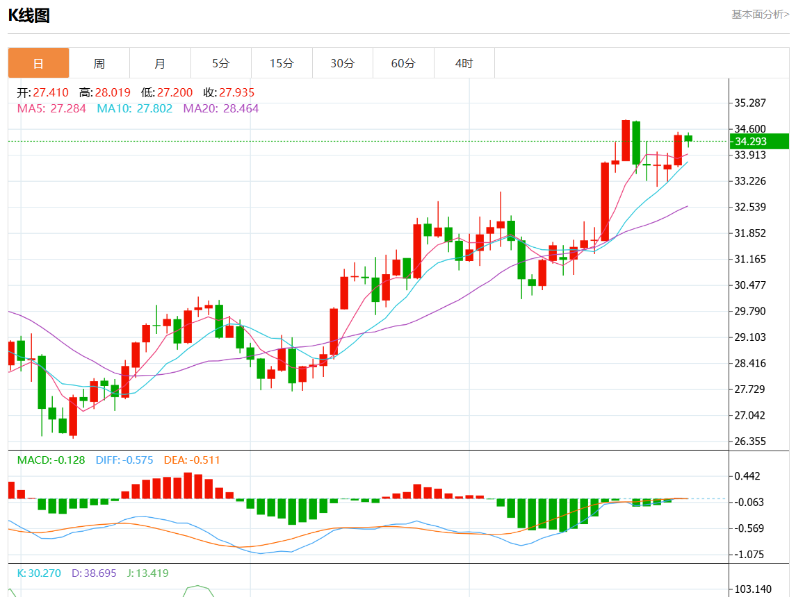 周三欧市盘中,现货白银报34.120,跌幅0.90%。