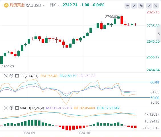 黄金价格小幅上涨,投资者为应对政治紧张局势做好了准备,此前民调显示,特朗普和哈里斯在美国总统大选中势均力敌,出现有争议结果的可能性很高。现货黄金上涨0.26%至每盎司2743.6美元。