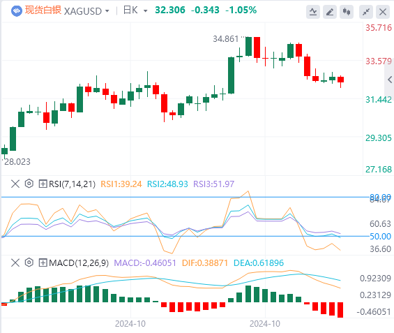 从波浪来看,白银自30.10-34.85完成一波五浪上行,当前处于针对此五浪的复合ABC调整浪之中,可尝试C浪的跟进。从下方MACD指标来看,空头量能明显占优。整体上来看,白银处于一波上行走势后的回调整理阶段。操作上建议逢高布局空单思路为主。