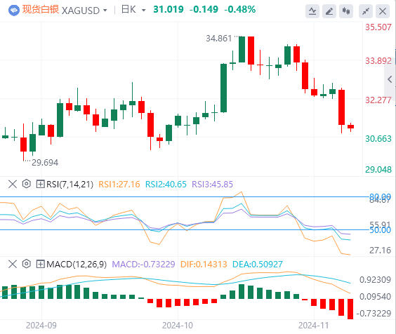 价格自低点起涨后,一路上行,最高上行至2789.8附近,短期受多头获利出场影响,价格有所回落,在昨日大选结果出炉,特朗普当选结果公布后,金价直线下挫,单日暴跌近100美金,均线系统在高位死叉,显示空头力量强势。上方关注2678.0附近压力。CCI指标在超卖区间拐头向上,显示价格随时可能反弹,日内若能反弹至2678.0附近,尝试布局空单。