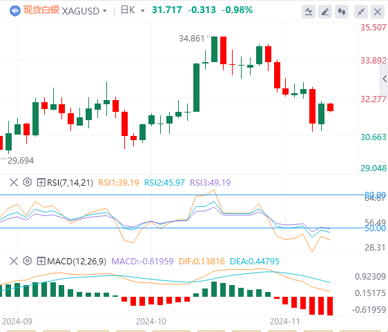 从形态结构看,白银多头高位调整震荡构建了一个箱体震荡形态,价格跌穿箱体底边支撑位确立了1小时级别空头趋势,目前行情仍处于下行通道浪中,昨日价格超跌反弹,价格受到下行趋势线压制,后续行情将继续延续下行浪。从下方MACD指标来看,快慢线0轴下方运行,表明空头力量主导行情,若死叉信号出现,新的主跌浪行情将展开。策略上建议短线反弹压力位埋伏空单思路为主。