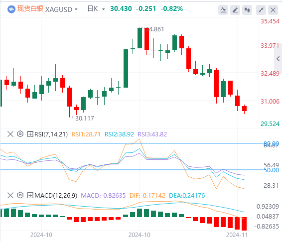 空头自34.85一线开始进场,价格不断创出新低,当前最低达到30.42一线,交易重心持续震荡下移,当前银价处于空头走势中。均线系统上,60均线低于100均线,且双双拐头向下,形成空头排列之势,表明银价处于强势下跌状态中。操作上,坚持顺势而为逢高做空的操作思路,关注压力位31.12一线,如若在此震荡承压,可考虑布局空单,下行关注前期低点30.42一线,若下破则进一步测试30.00的整数关口。