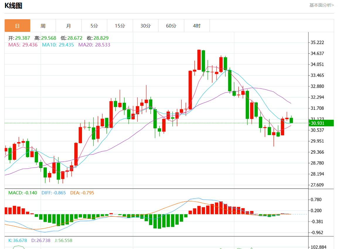 周三欧市盘中,现货白银报30.910,涨幅0.90%。
