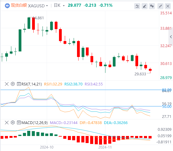 近期空头自31.52一线开始进场,价格不断创出新低,当前已盘中跌破30.00的整数关口,交易重心持续震荡下移,当前银价处于偏空走势中。均线系统上,60均线低于100均线,且双均线拐头向下,表明银价处于承压走势中。操作上,坚持顺势而为逢高做空的操作思路,关注压力位30.26一线,如若在此承压,可考虑布局空单,下行关注当前低点29.66一线,若下破,则打开下行空间。