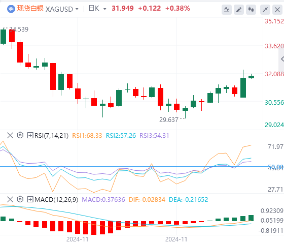 从形态结构看,白银多头在关键支撑位29.55企稳后,一路震荡向上反弹,昨日价格突破关键压力位31.30打开上涨空间,继续延续多头上涨浪结构。从下方MACD指标来看,快慢线0轴上方运行,表明多头力量主导行情。策略上建议在形态关键支撑位埋伏多单思路为主。