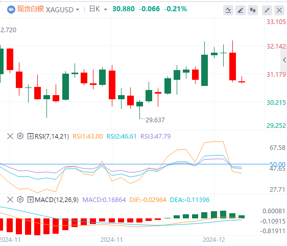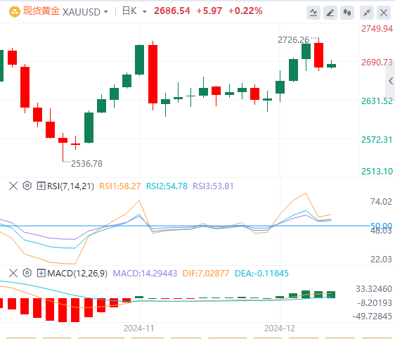 金价下跌超过1%,原因考虑到12月降息预期基本落地,交易者在盘初短暂触及五周高点后获利了结。现货金收跌1.2%,报每盎司2684.2美元附近。