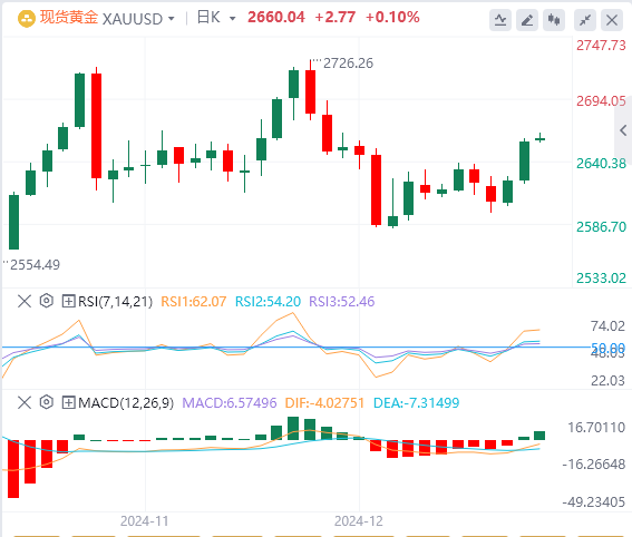 金价触及逾两周最高,受避险买盘推动,市场评估美联储利率前景和美国当选总统特朗普贸易关税提议的可能影响。现货金收涨1.32%,报每盎司2658.5美元附近。