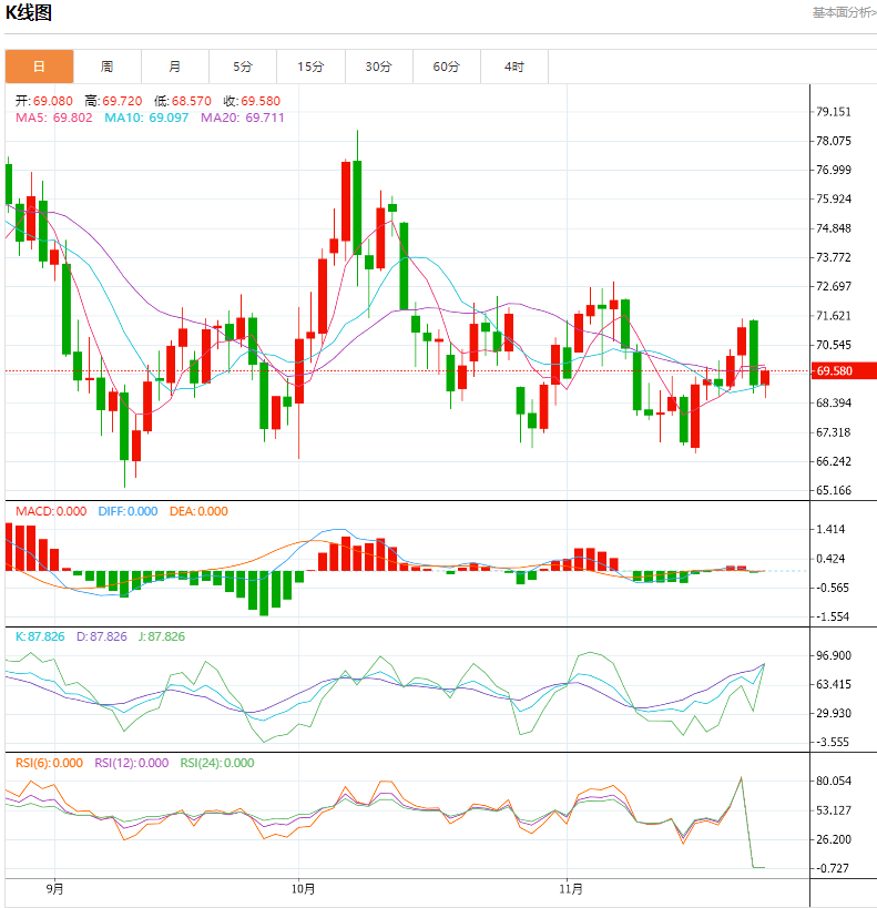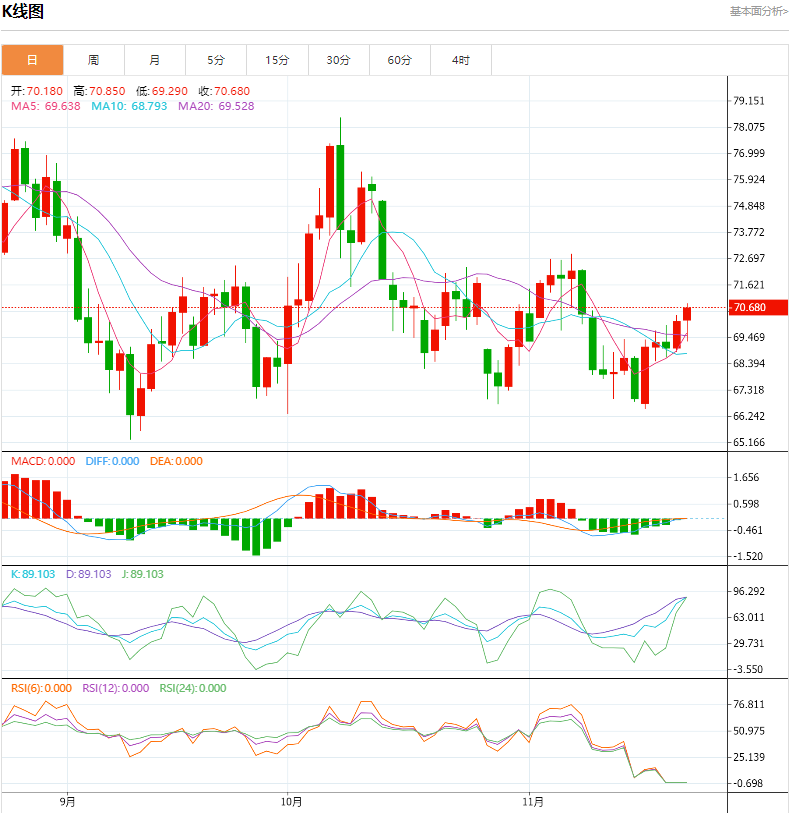 星期五(11月22日)亚盘时段,美原油价格目前交投于70.3美元/桶附近。市场焦点短期聚焦在俄乌地缘冲突,本周紧张局势出现升级,市场对地区能源供应中断的担忧情绪升温,推动国际原油价格反弹走高。 原油盘面分析: 原油H4级别震荡反弹,并依旧在48日多空分界线上方运行。此外,ACD双线和量能柱在零