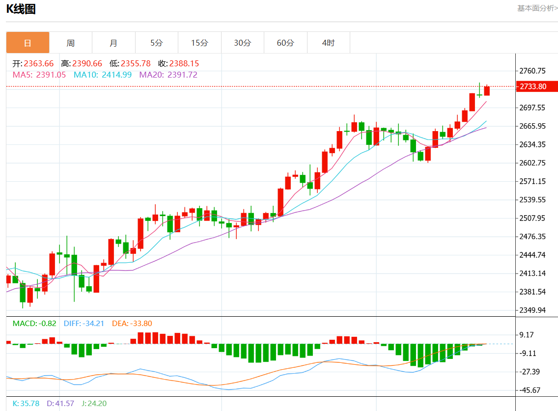周一早盘,黄金价格继续高开高走,目前已到达2729美元/盎司附近,连续创出新的历史高点,走势偏强。受地缘局势紧张,美国大选的不确定性,以及美联储降息的货币政策影响,给黄金带来支撑,促使价格上行创历史。 中东的地缘政治仍在发酵,以色列及其敌人哈马斯和真主党承诺继续在加沙和黎巴嫩交战,这使人们对以色列击毙