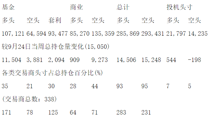 美国商品期货交易委员会(CFTC)最新公布截止10月1日当周COX铜期货和期权分类持仓报告: 合约单位:25000磅总持仓量:307666