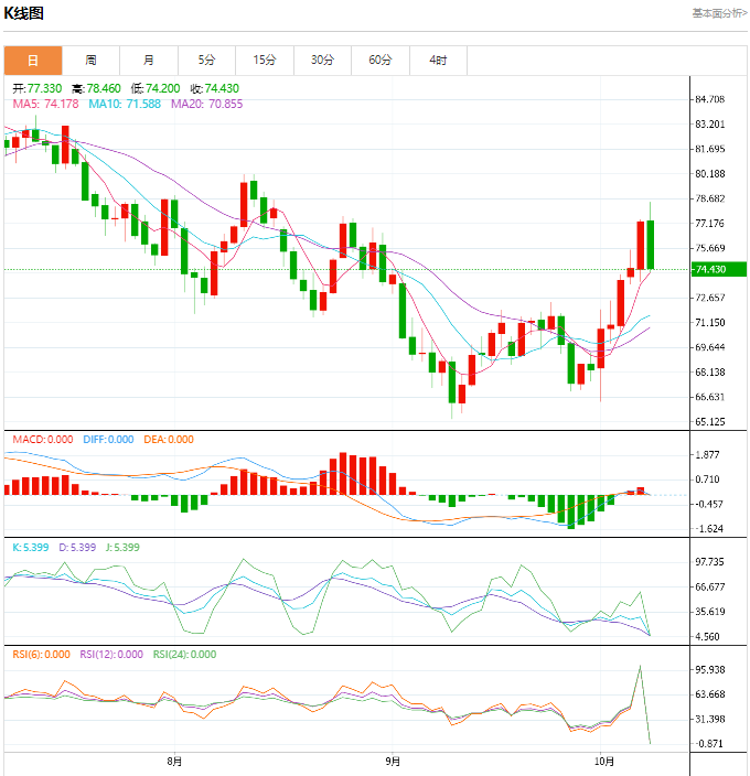 由于以色列与伊朗地缘政治风险大幅上升,市场紧张情绪升温,国际原油价格连续拉升形成多头强势单边上行节奏,接下来留意中东动荡局势可能进一步升级。 原油盘面分析: WTI原油期货面临阻力,如果价格攀升到77.15美元上方,200天的A应该会像周二早盘一样阻止进一步的上涨。下行方面,旧的阻力已经变成了支撑。