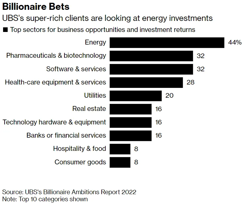 附图是瑞银的50位亿万富豪客户最为关注的投资领域的前十名,由图可见,能源行业是这些超级富豪最为关注的领域,其次分别是制药和生物技术、软件与服务、保健设备和服务、公用事业公司、房地产、技术硬件和设备、银行或金融服务、酒店和食物,以及消费品。 从瑞银的报告来看,瑞银的超级富豪客户们正在押注能源行业将在