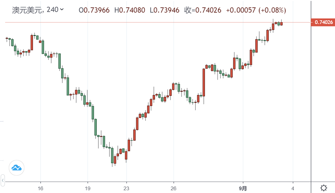 4小时图显示,过去两周在主要货币对中,没有哪个货币对像澳元/美元这样显露出如此明确的趋势。8月20日澳元/美元在0.7100一线构筑底部,并且自那以后便一直上行。澳元/美元300点的涨幅让,欧元/美元200点的波动以及英镑/美元220点的震荡看起来微不足道。
