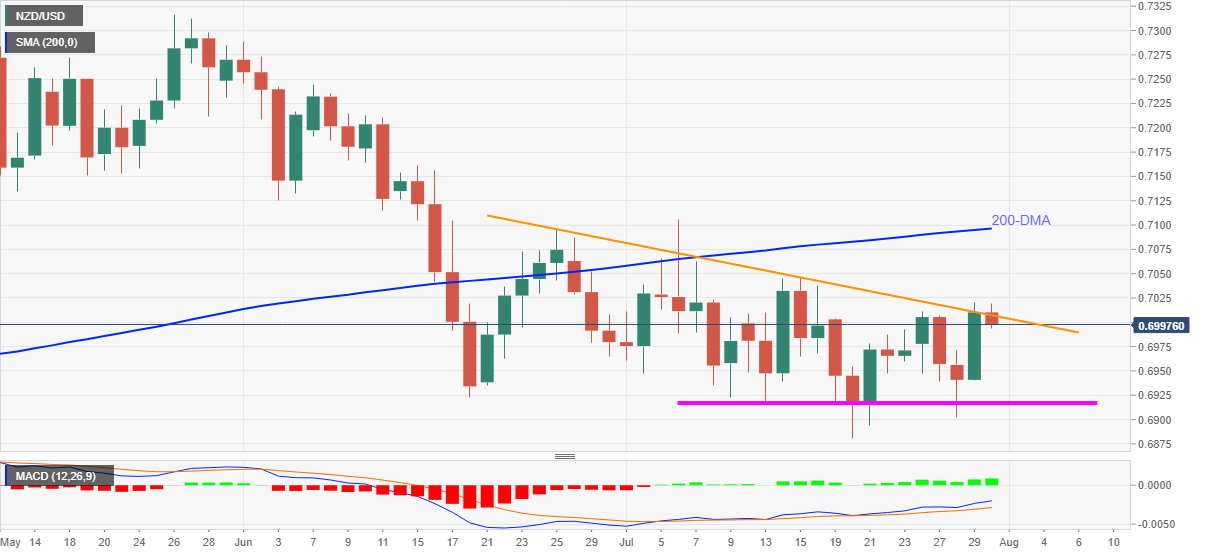 纽元兑美元从两周高位回落至0.7000,周五早些时候下跌了0.15%。纽元兑美元在前一天创下了两周以来的最大涨幅,但未能越过向下倾斜的趋势线。 鉴于看涨的ACD指标和该货币对屡次未能突破7月13日以来建立的0.6920水平支撑区,纽元兑美元的价格可能会继续走强。 即便如此,短期回调至指定的水平支撑线仍不可忽视,其中0.69