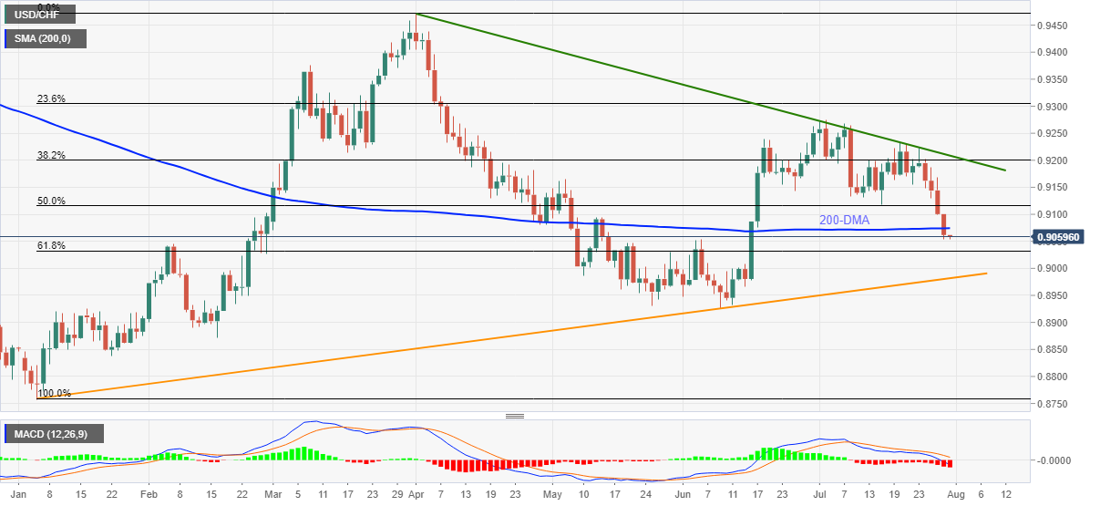 周五交易时段,美元兑瑞郎在0.9050附近低于10点的区域内拾起竞价。在突破200日移动均线后,该货币对前一天跌至6月16日以来的最低水平。 考虑到ACD指标看跌,且日收盘价低于关键移动均线,卖家可能会继续持仓,直到出现明显上行突破90.75(200日移动均线)。 即便如此,1-4月上行和7月15日低点约0.9115的50%斐波那契回档