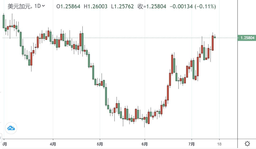 周五亚盘,美元/加元触及1.2585日高,录得7月8日以来的高位,录得一周高水平。上周美元/加元创下高位1.2591,若汇价突破该水平,将交投于4月以来的高位。 基本面分析 加拿大央行行长Tiffacckl对加拿大媒体表示,通胀上升可能是暂时的,但如果不是,可能会加息,加元面临压力。然而,他强调“这不是自动加息”,加央