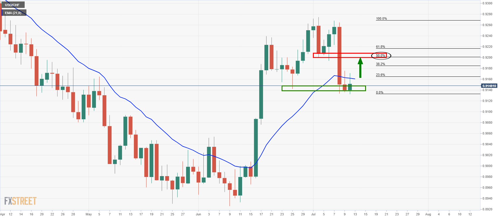 美元兑瑞郎的价格停滞不前,并进入了一个短期横向通道,这增加了美元兑瑞郎大幅上行修正的可能性。 下图展示了日图和小时图中的看涨倾向: 日线图 由于美元兑瑞郎在21均线附近停滞,多头正处于走高的边缘。 从较低的时间框架开始,一个目标0.9200区域和阻力结构与50%均值回归汇合的最佳切入点。 小时图 在小