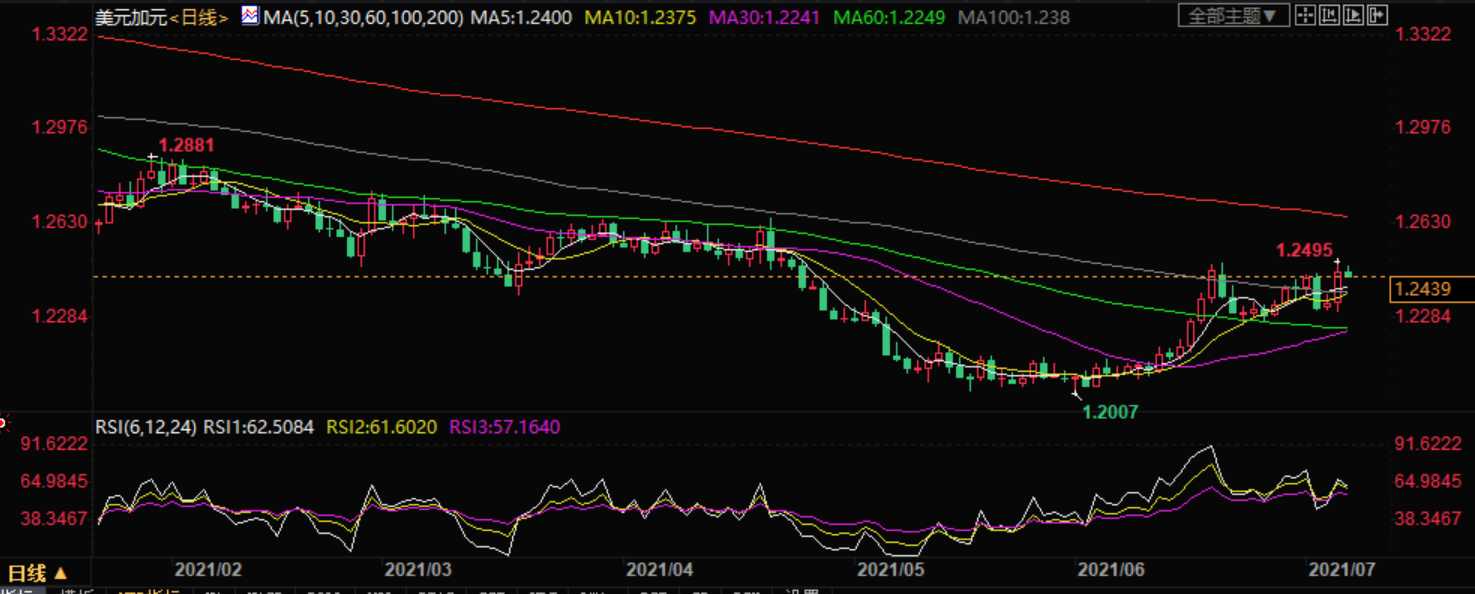 周四欧盘,美元兑加元获得新的买盘,过去一个小时冲高至4月21日以来的最高水平1.2550附近。多重有利因素帮助美元兑加元延续本周强劲涨势,周四汇价连续第四日上涨。美元接近三个月高点,仍受到美联储最快于今年收紧货币政策前景的良好支撑。此外,近期油价回落打压商品货币加元,进一步提振该货币对上涨。截止发稿,美元