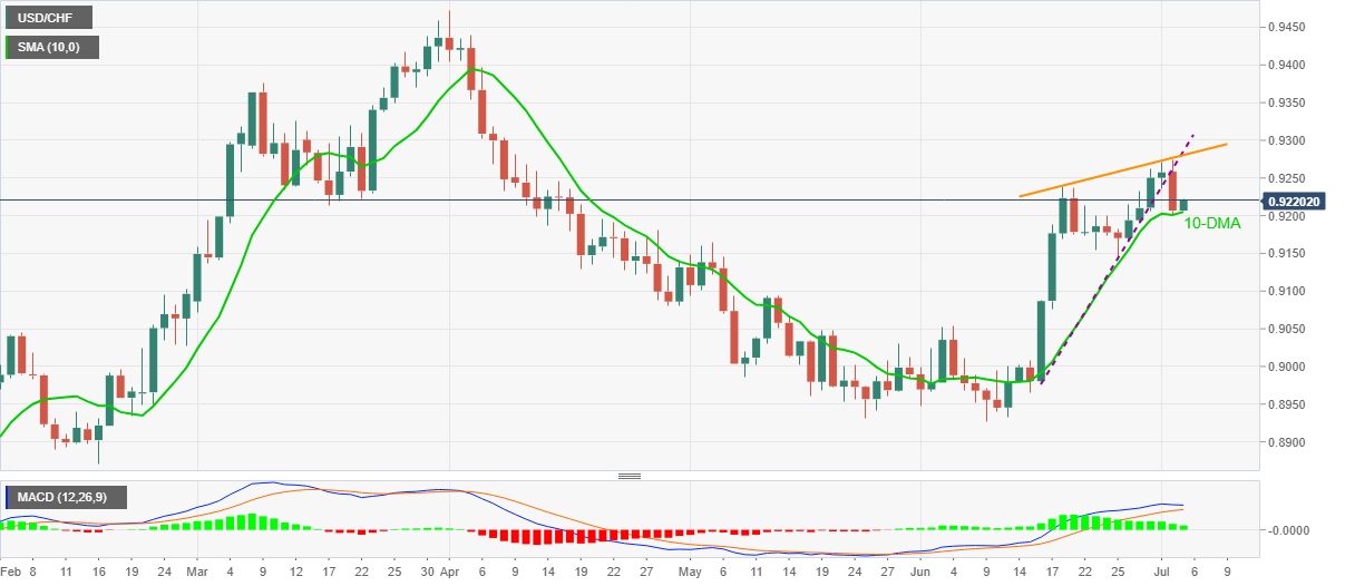 周一亚洲市场,美元兑瑞郎的买入价回升至0.9218,盘中高位0.9223。在此过程中,瑞士法郎对从10日移动均线(DA)急转直下,巩固了前一天的跌幅,这是一个月来最大的跌幅。即便如此,该指数延续了周五所描绘的13日趋势线击穿。 鉴于ACD指标的看涨偏见正在消退,该货币对可能在接近6月25日0.9142附近的低点时继续承压。 在