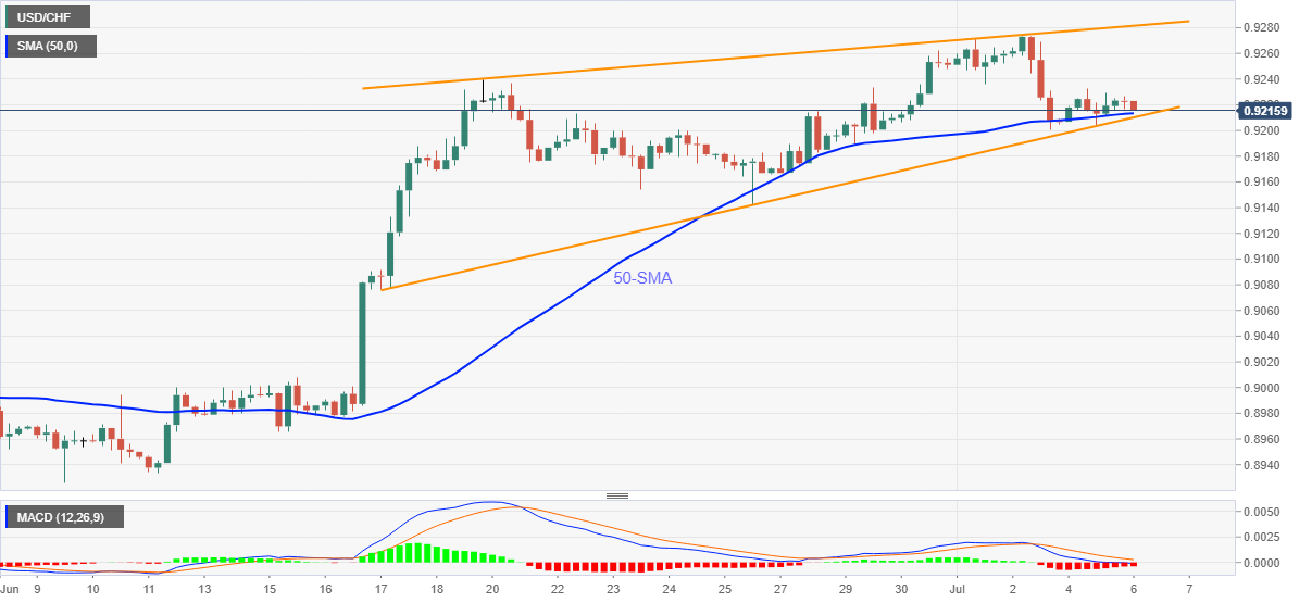 到目前为止,美元兑瑞郎在本周的25个基点的交易区间内保持低迷,最近在周二的亚洲交易时段回落至0.9218。 在此过程中,主要货币对挣扎着从50移动平均线恢复,同时维持在两周以来的上升楔形看跌形成的支撑线附近。考虑到ACD指标的悲观状况,加上该货币对多次未能突破0.9200,美元兑瑞郎空头仍抱有希望。 然而,若要明显