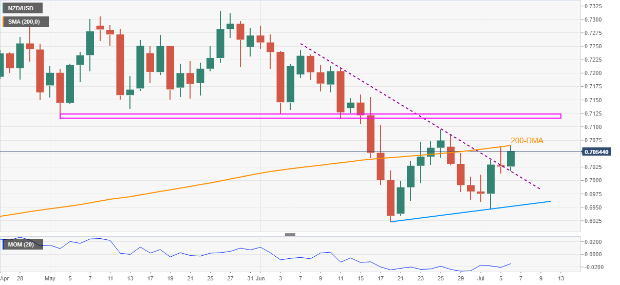 周一,纽元兑美元从短期关键阻力线转向0.7000,到周一早些时候,在0.7023附近下跌了0.08%。 新西兰元对的最新走势从中国财新服务业I(50.3,低于预期的55.7和之前的55.1)以及悲观的市场情绪中得到了线索。 尽管0.7000这一心理磁铁吸引了日内卖家,但周五0.6945附近的低点和接近0.6925-20的年度底部将在之后测试纽元/美