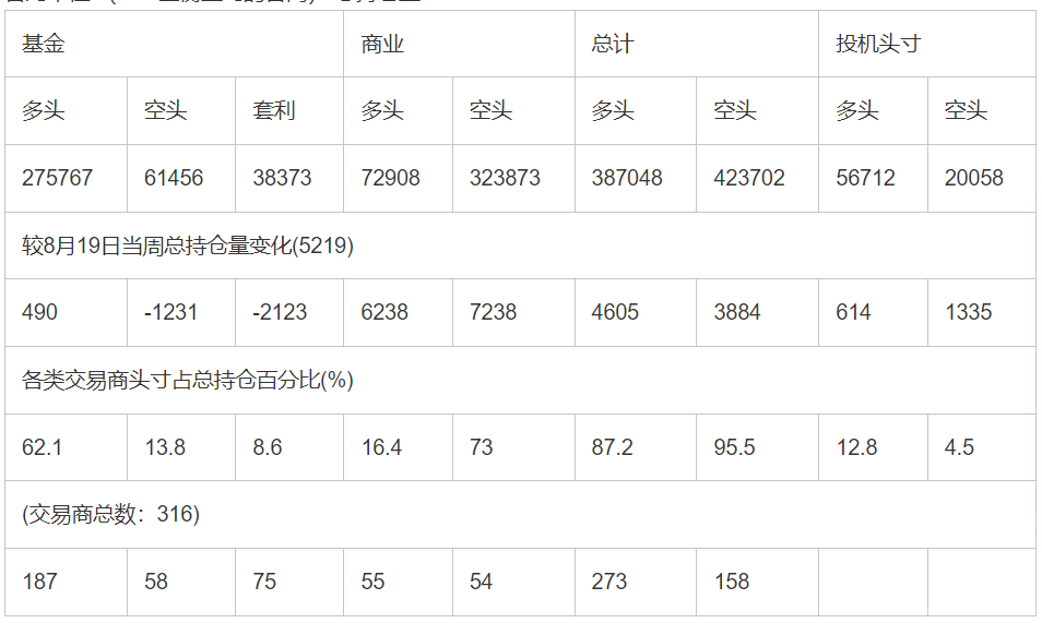 截止8月26日当周COX(纽约商品期货交易所)黄金期货分类持仓报告: 合约单位:(100金衡盎司的合同)总持仓量:443760