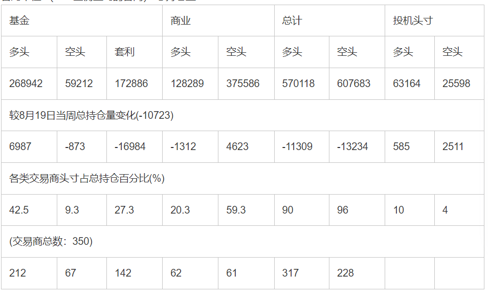 截止8月26日当周COX(纽约商品期货交易所)黄金期货和期权分类持仓报告: 合约单位:(100金衡盎司的合同)总持仓量:633282
