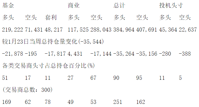美国商品期货交易委员会(CFTC)最新公布截止1月30日当周COX黄金期货分类持仓报告: 合约单位:100金衡盎司总持仓量:430328