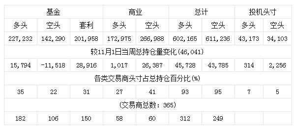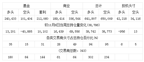 美国商品期货交易委员会(CFTC)最新公布截止11月8日当周COX黄金期货和期权分类持仓报告: 合约单位:100金衡盎司总持仓量:645338
