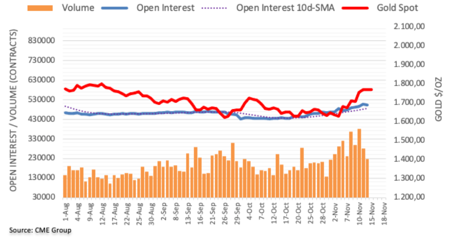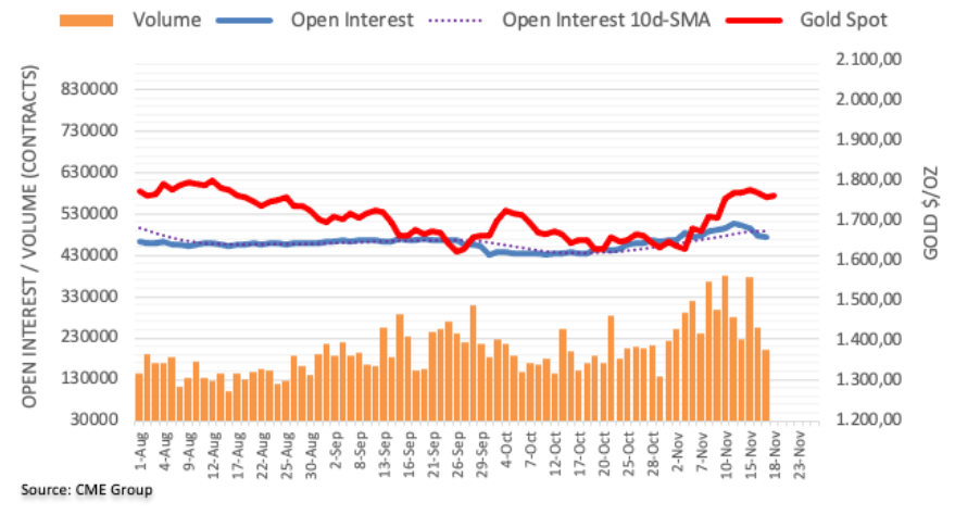芝加哥商品交易所(CGrou)公佈的黄金期货市场初步数据显示,週三未平仓合约延续跌势,这一次约减少了0.13万份合约。相反,成交量仍然波动,增加了约3.23万份合约。 金价在1750美元附近面临坚实阻力 週三,金价大幅上涨,并一度重回每盎司1750美元的区间。不过,金价上涨是建立在未平仓头寸减少的基础上,暗示近期反弹可