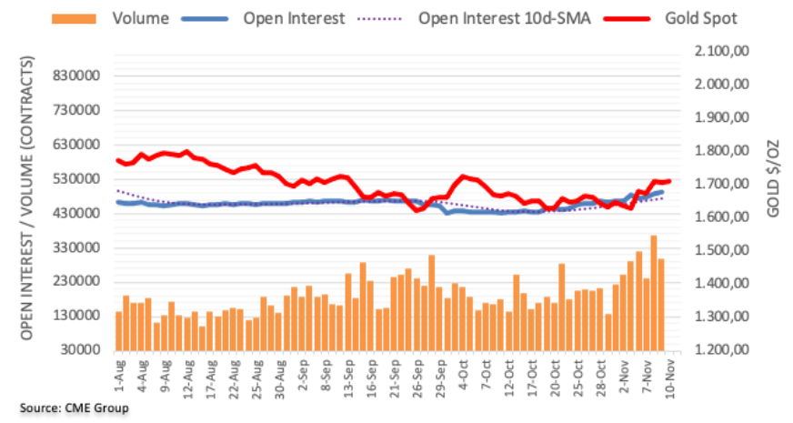 芝加哥商业交易所集团黄金期货市场最新数据显示,週三黄金未平仓合约连续第三日增长,此次增长愈0.3万份。相反,成交量下降约6.74万份合约,部分逆转此前增长。 黄金:下一上涨目标为1730美元 週三金价录得新高后收跌。价格下跌之际未平仓合约增加,可能允许金价在短线进一步调整。与此同时,金价将继续升向10月高点