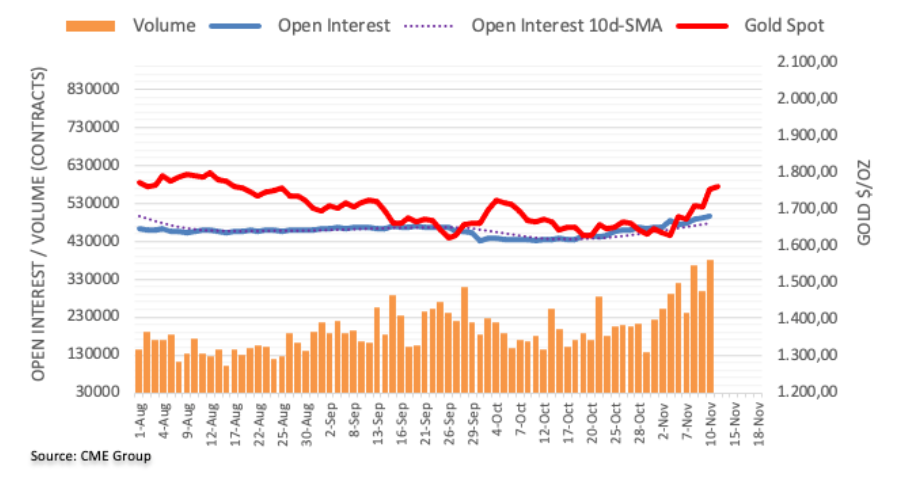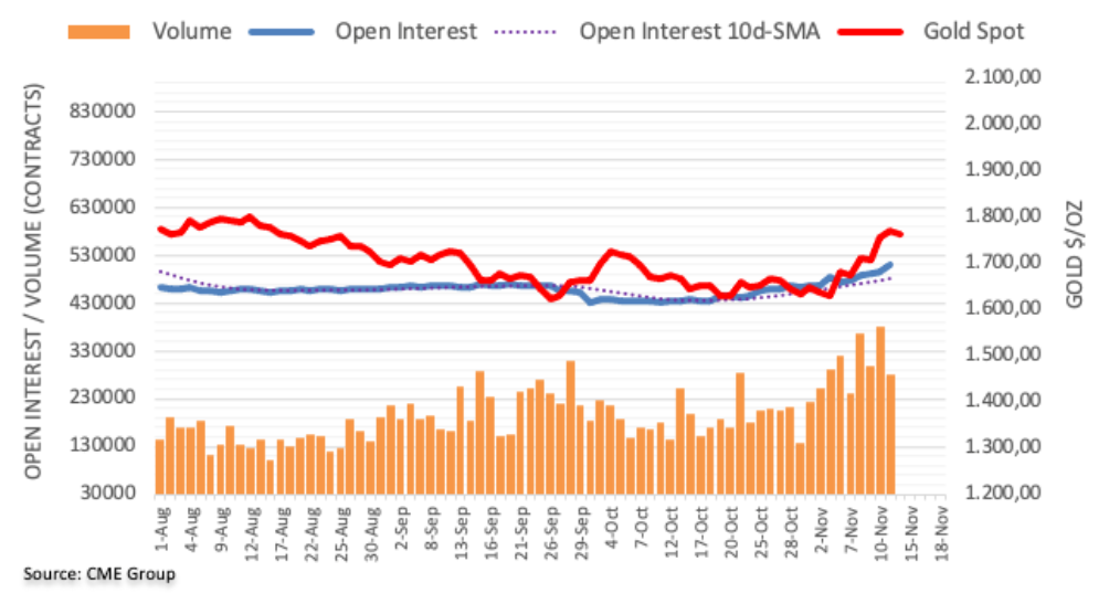 芝加哥商业交易所集团黄金期货市场的最新数据显示,上周五交易员增持其未平仓合约约1.27万份,连续第五日增长。相反,成交量依然震盪,下降约9.83万份合约。 金价依然指向1800美元区域 周五金价继续大幅反弹,同时未平仓合约增加。对此,进一步上涨势头可能推动该贵金属挑战1800美元的关键阻力位。该区域和关键的20