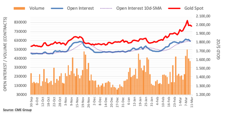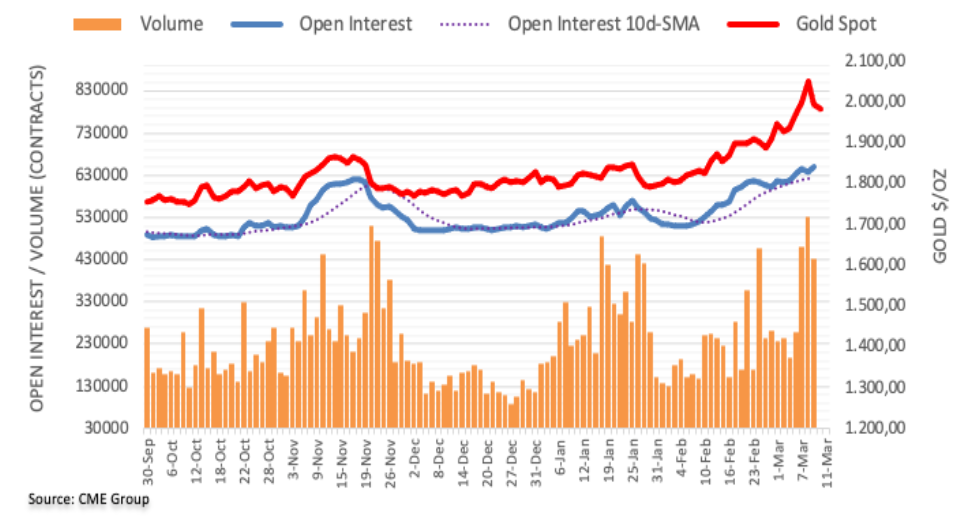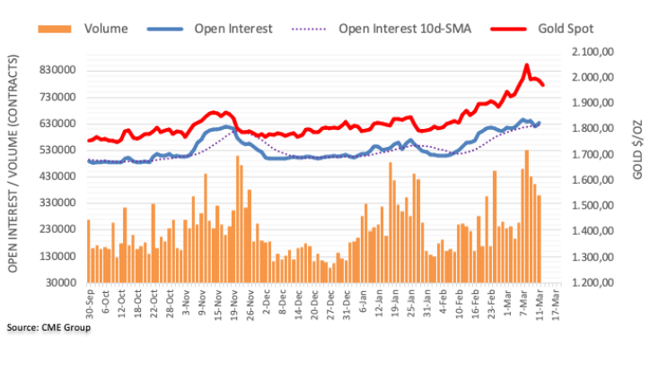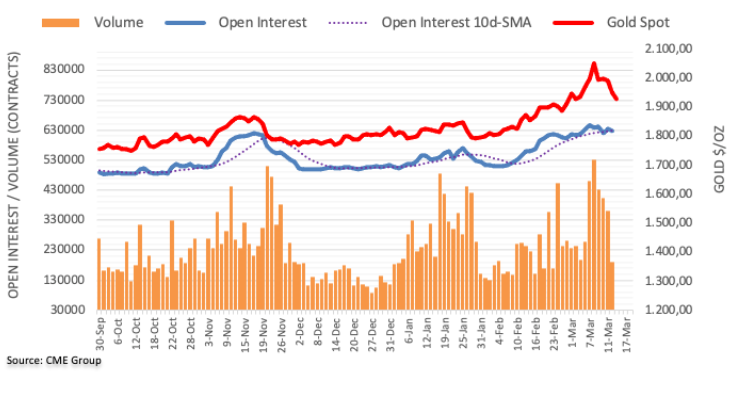 考虑到芝加哥商业交易所集团黄金期货市场的最新数据,周一黄金未平仓合约下降约0.83万份,逆转前一日部分增长。与此同时,成交量再度下降,此次下降约17.06万份合约。 黄金:料再度测试1900美元 金价周初继续下跌,同时未平仓合约和成交量齐跌。对此,金价仍可能进一步回落,支撑位于3月1日触及的月度低点1900美元/