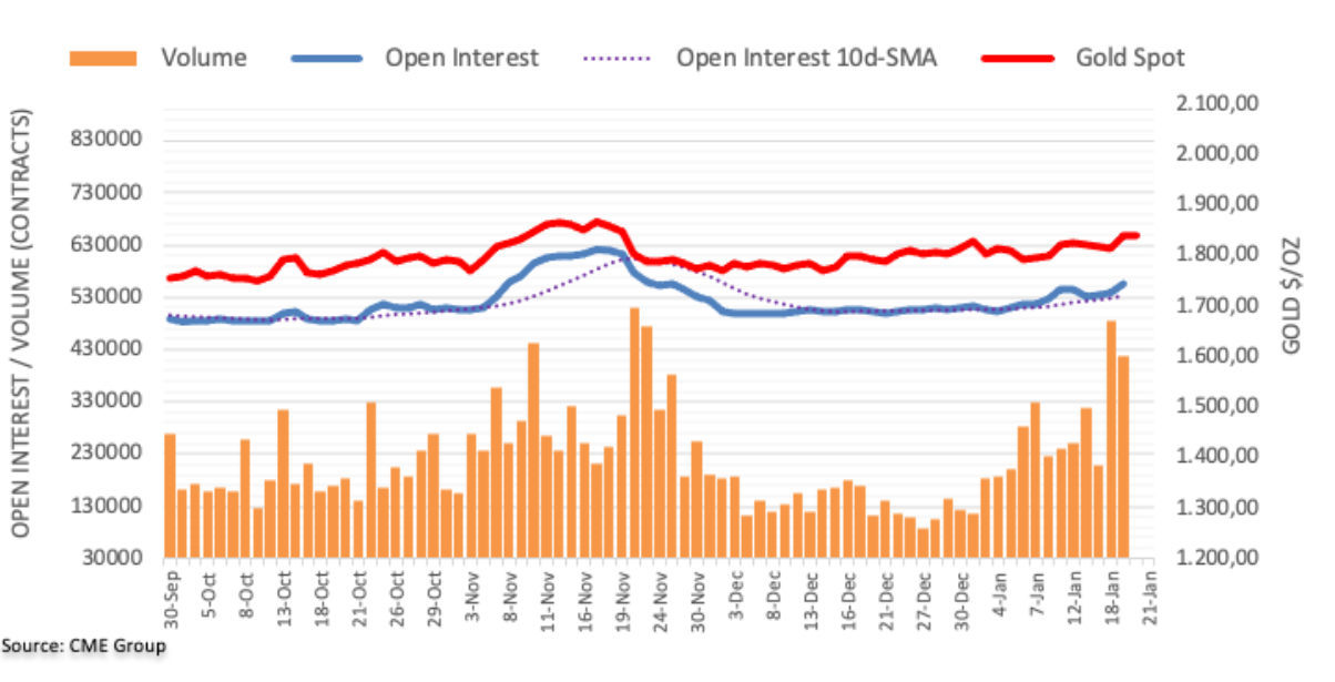 考虑到芝加哥商业交易所集团最新数据,周三黄金期货市场未平仓合约连续第三日增长,此次增长约1.69万份。相反,成交量延续震荡表现,下降约6.86万份合约。 金价目前指向1877美元 周三金价强势上扬之际未平仓合约增加,依然支撑金价短线进一步上涨,下一目标为2021年11月高点1877美元(11月16日)。不过成交量下降表