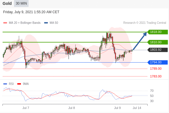 在1794.00之上,看涨,目标价位为1810.00,然后为1818.00。 转折点:1794.00 交易策略:在1794.00之上,看涨,目标价位为1810.00,然后为1818.00。 备选策略:在1794.00下,看空,目标价位定在1789.00,然后为1783.00。 技术点评:1794.00附近形成了一个支撑的底部,将带来走势短期内的稳定。 阻力位: 1826.00 1818.00 1810