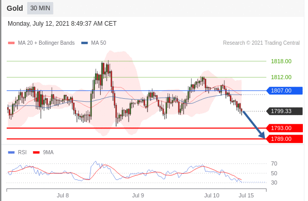 周四(7月8日)亚市盘中,黄金期货维持跌势,现报1796.50美元/盎司附近。Khitij咨询服务团队(KhitijConultancyrvic)周四最新撰文,对黄金期货、白银期货、原油期货和铜期货后市走势进行前瞻分析。 黄金方面,Khitij咨询服务团队表示,黄金期货再次下跌,可能跌向1780/60美元/盎司。我们继续预计短期内期金将维持在1820-17