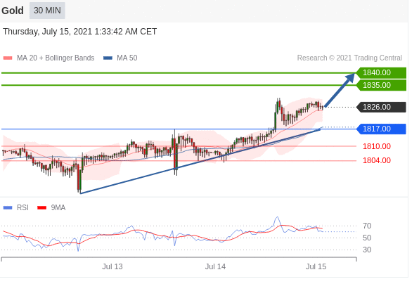 芝加哥商品交易集团数据显示,周一黄金期货市场未平仓合约仅增加347手合约,逆转连续两日减少的趋势。同时,黄金期货交易量继连续三日下降后,周一上升约11.08万手合约。 金价目标处在1,860美元区域 由于黄金期货未平仓合约和交易量上升,金价周初开始走高。也就是说,黄金有望短线进一步上涨,下一个目标在斐波位1,86