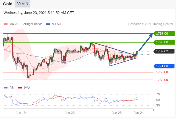 周一(6月21日)亚市盘中,黄金期货实现反弹,现报1774.50美元/盎司左右。Khitij咨询服务团队(KhitijConultancyrvic)周一最新撰文,对黄金期货、白银期货、原油期货和铜期货后市走势进行前瞻分析。 黄金方面,Khitij咨询服务团队表示,黄金期货从1764美元/盎司小幅上涨,目前维持在支撑位1760美元/盎司之上。如果能够维持