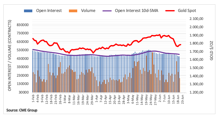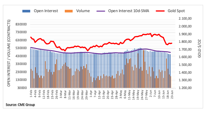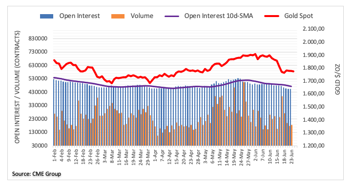 芝加哥商业交易所集团黄金期货市场的数据显示,周二交易员再度削减黄金未平仓合约,此次削减0.26万份。值得指出的是,自6月11日以来黄金未平仓合约持续下降。与此同时,成交量连续第三日下降,此次下降越2.36万份合约。 金价仍在1760美元附近获得支撑 周二金价下跌同时未平仓合约和成交量齐跌,短期可能不会进一步下