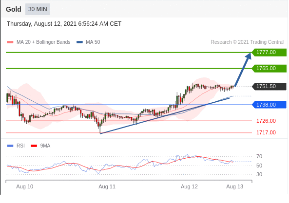 随着美元走弱,贵金属出现反弹,现货黄金昨日涨逾20美元,一度刷新日高至1754.45美元/盎司,本交易日(8月12日)亚盘初,黄金价格小幅回调,不过跌幅有限,金价料暂维持盘整格局。 隔夜美国公布的7月份消费者价格指数(CI)显示,7月CI环比上涨0.5%,前值上涨0.9%,与分析师的预期一致。美国7月CI年率上涨5.4%,已连续