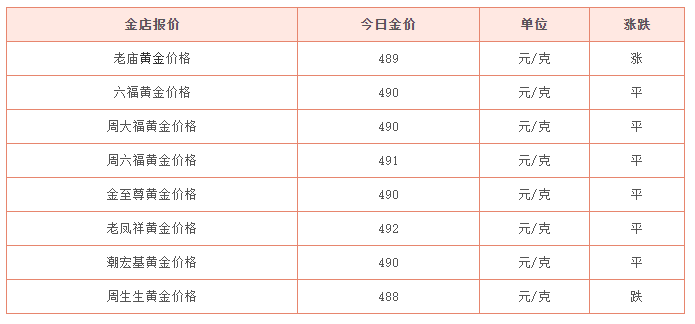 黄金价格今天多少一克(2021年8月5日) 品牌 价格 纯度 涨跌 周大福 490克 99.9% 平 周生生 488克 99.9% 跌 老庙 489