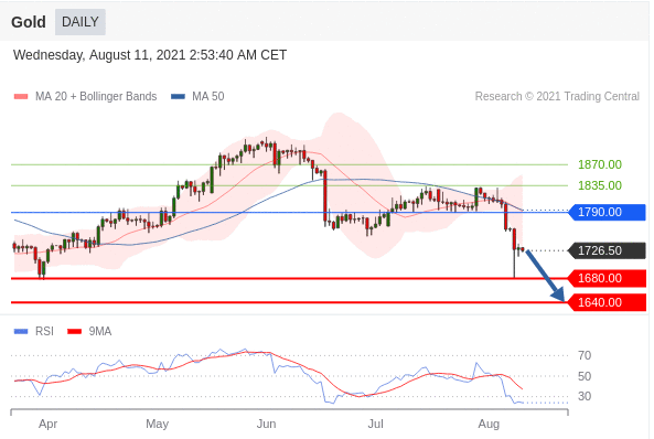 黄金/美元可能在下一轮下跌前进行技术调整。 若日收盘价高於1,760美元,则可能使黄金进入盘整阶段。 继上周五的抛售之後,黄金在本周初遭受了严重跌势,在两天的下跌中损失超过4%。尽管黄金/美元在周一下半天设法收复了部分失地,但它难以延续其反弹势头。截至撰写本文时,这对货币兑美元汇率在当日几乎没有变化,为1730