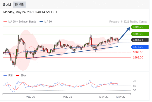 周一(5月24日)亚洲时段,现货黄金小幅上涨,交投于1882美元/盎司附近。比特币投资的高波动性给了黄金投资者更大的信心,美联储维持宽松政策依然是目前官员中主流的声音,且大型基金公司5月开始不断增持黄金,这些因素推动金价继续维持涨势。不过,美元指数上周五(5月21日)再度的反弹令金价承压,且美联储哈克也加入减码