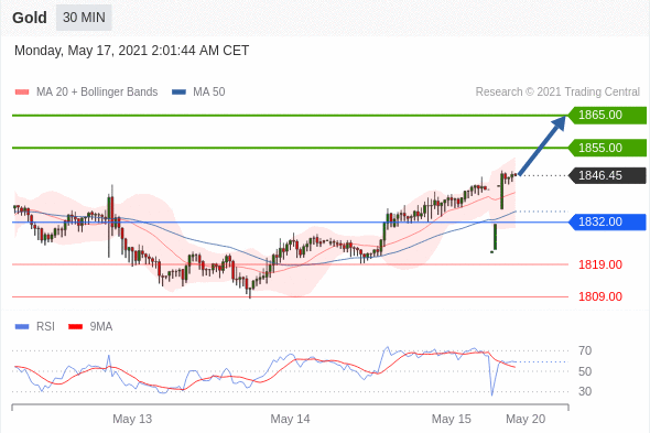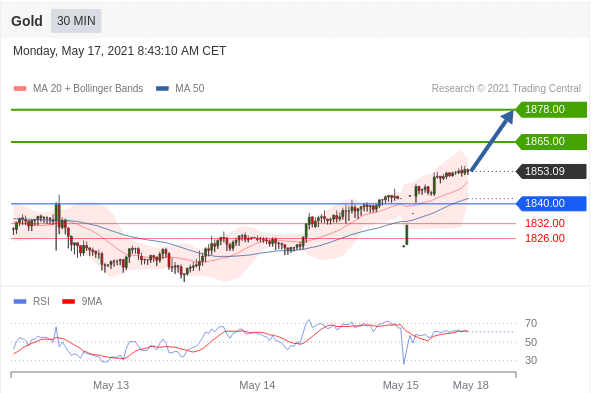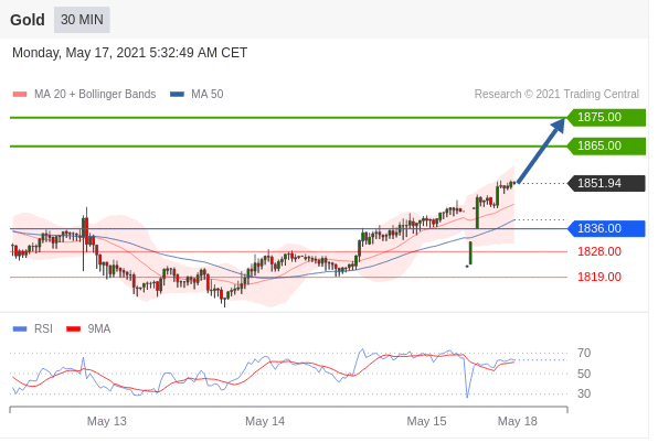 黄金当日内:进一步上涨。 在1840.00之上,看涨,目标价位为1865.00,然后为1878.00。 转折点:1840.00 交易策略:在1840.00之上,看涨,目标价位为1865.00,然后为1878.00。 备选策略:在1840.00下,看空,目标价位定在1832.00,然后为1826.00。 技术点评:RI技术指标呈现进一步上升趋势。 阻力位: 18