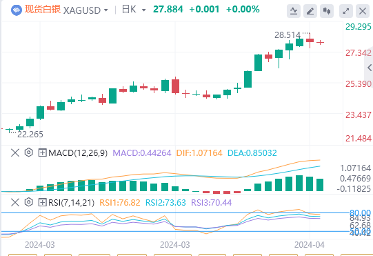 白银价格小幅下跌,位于27.90美元左右,从三年高点28.53美元回落。这种回调受到市场对美联储利率轨迹的重新评估的影响,尤其是在美国3月份CPI显示通胀持续之后,数据同比攀升至3.5%,月度攀升至0.4%。
