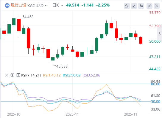 白银价格难以维持20天指数移动平均线(EMA),该指数交易价约为49.50美元。
