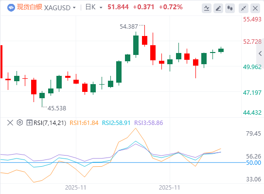 日线图中,白银报51.94美元。20日指数移动平均线上升,价格守在上方,强化了上行偏向并改善了趋势质量。RSI在59.15保持在中性中线之上,确认了正向动能且无超买压力。初步支撑位与20日均线50.40美元相符,暗示下跌可能继续受控。
